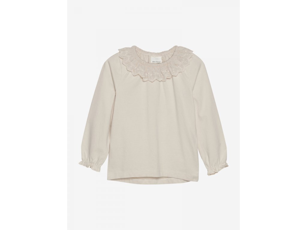 Tričko s dlhým rukávom od EN FANT. Tričko je jednoduché. Na konci rukávov má gumičku. Na krku je veľký golier s krásnou čipkou. Na konci rukávov je malý volánik.