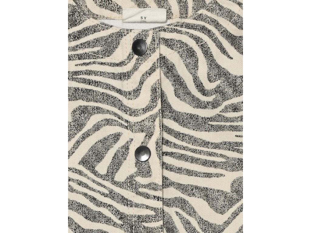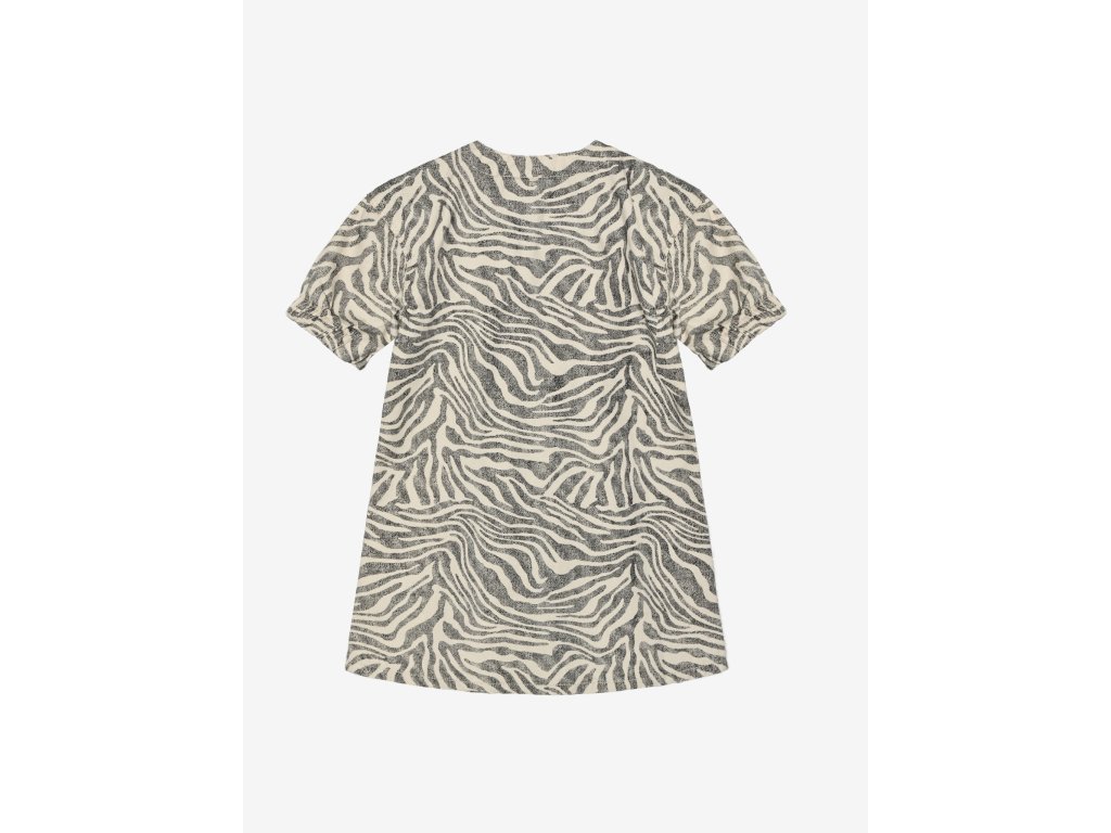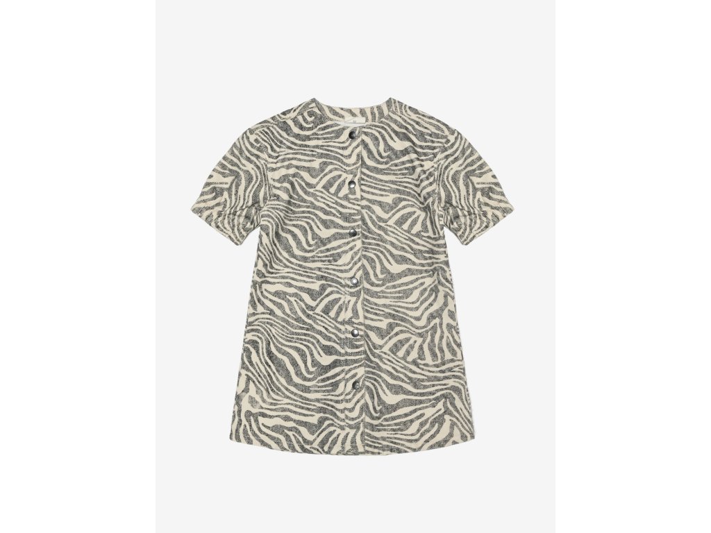 Šaty s celoplošnou potlačou inšpirovanou zebrou od značky Minymo. Šaty majú gombíky vpredu, krátke rukávy a okrúhly výstrih. Certifikované podľa normy OEKO-TEX® STANDARD 100, č. certifikátu 2276-364 DTI.