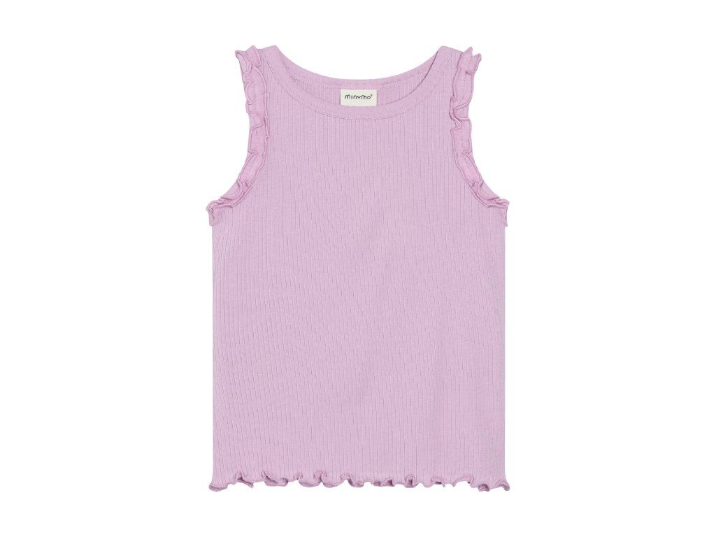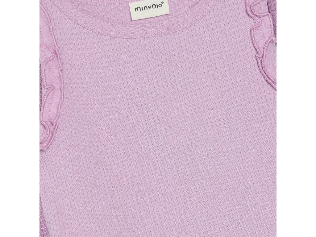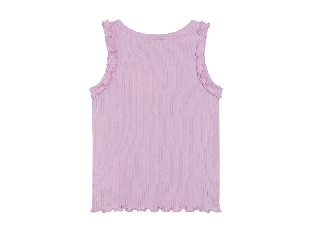 Dievčenský top od značky Minymo v jednofarebnom prevedení z jemného rebrovaného materiálu. Ramienka sú zdobené volánikmi a spodný lem má jemne vlnitý efekt, ktorý dodáva topu štýlový vzhľad.
