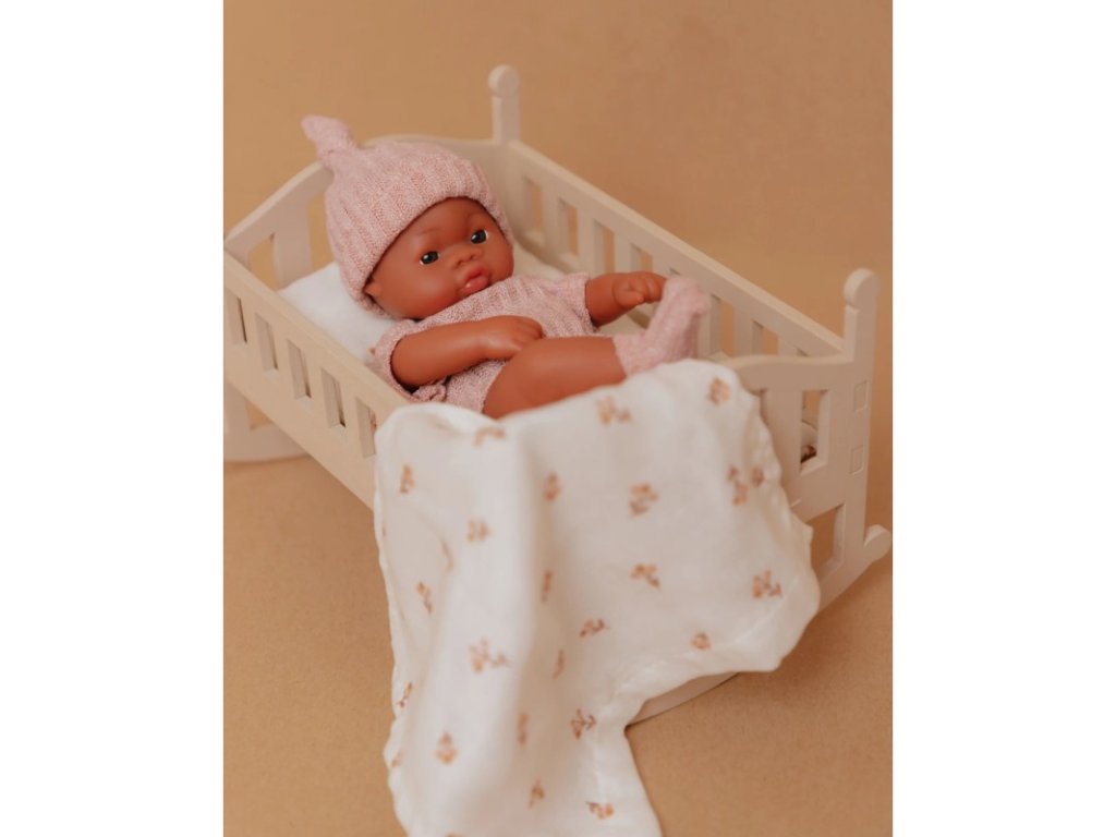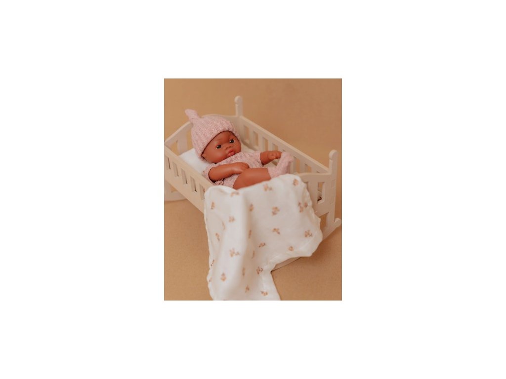 Táto malá bábika Jossie s výškou 20 cm, je zabalená v nádhernej darčekovej sade spolu s ručne vyrobenou hojdacou kolískou z kvalitného dreva. Súčasťou balenia je aj mäkučká posteľná bielizeň – prikrývka, vankúšik a plachta s jemným motívom a jedinečným dizajnom.